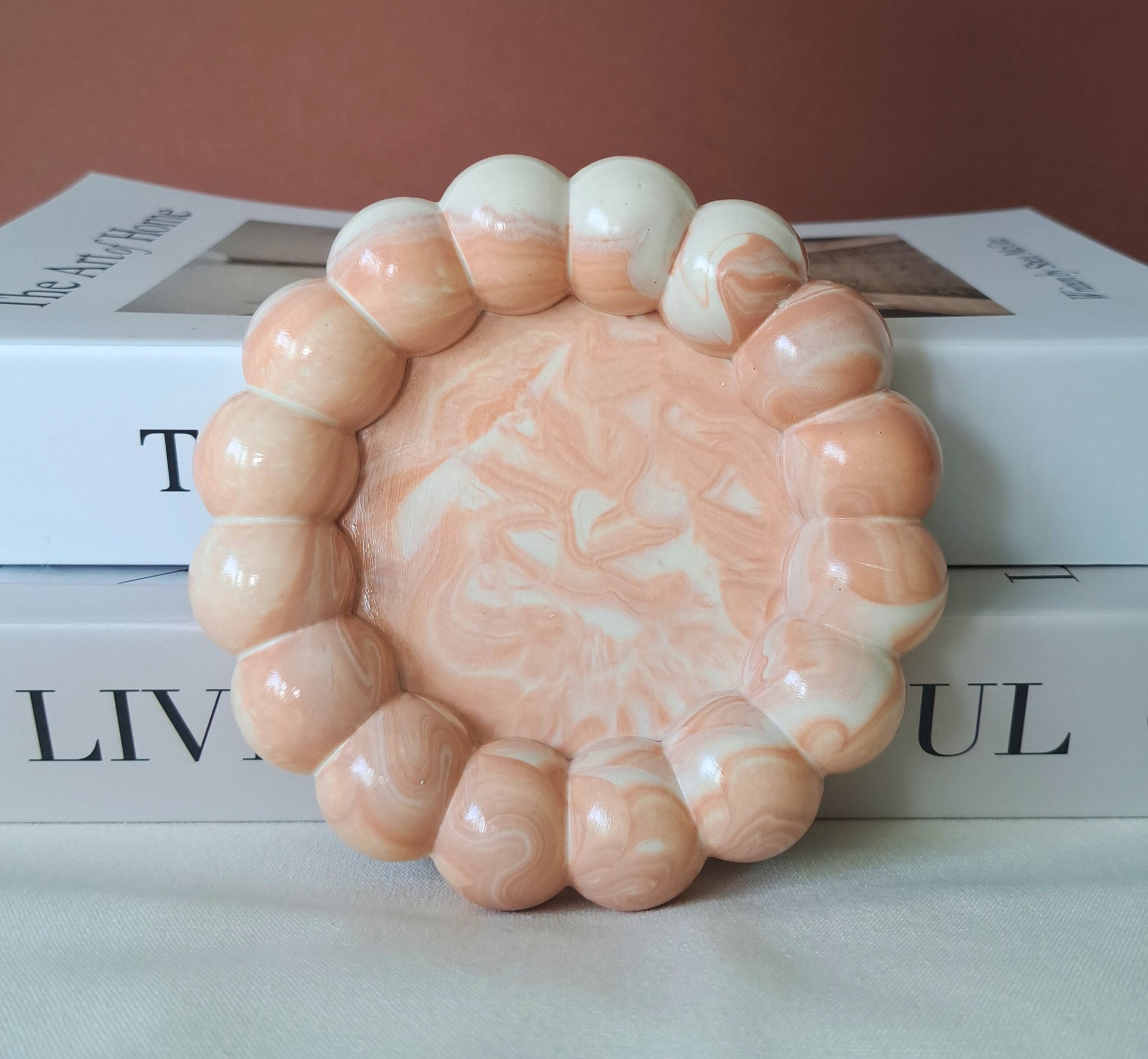 Prato decorativo redondo com efeito mármore.