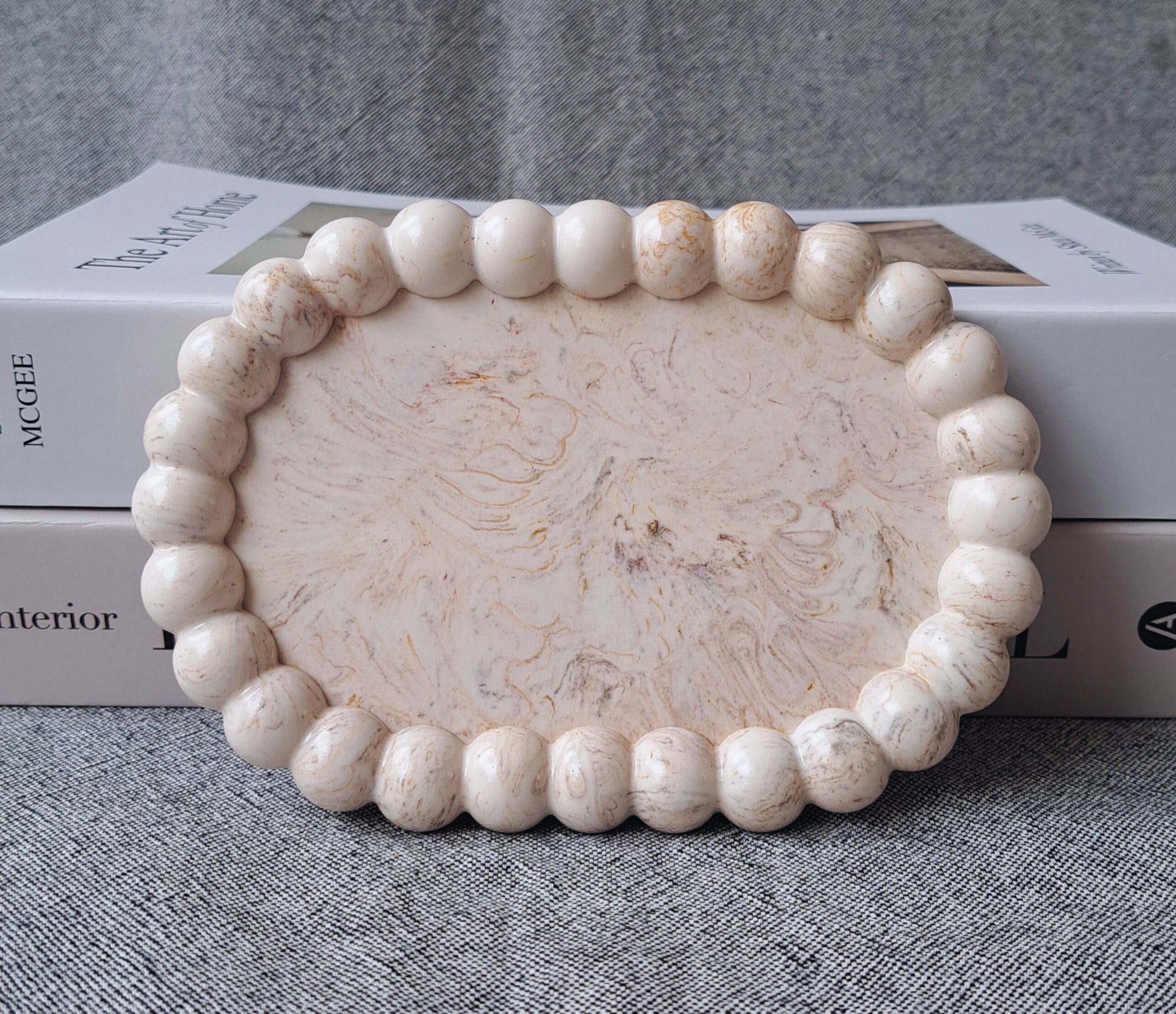 Prato decorativo oval em tons outonais de amarelo, bege e terracota, que trazem calor e elegância a qualquer espaço.