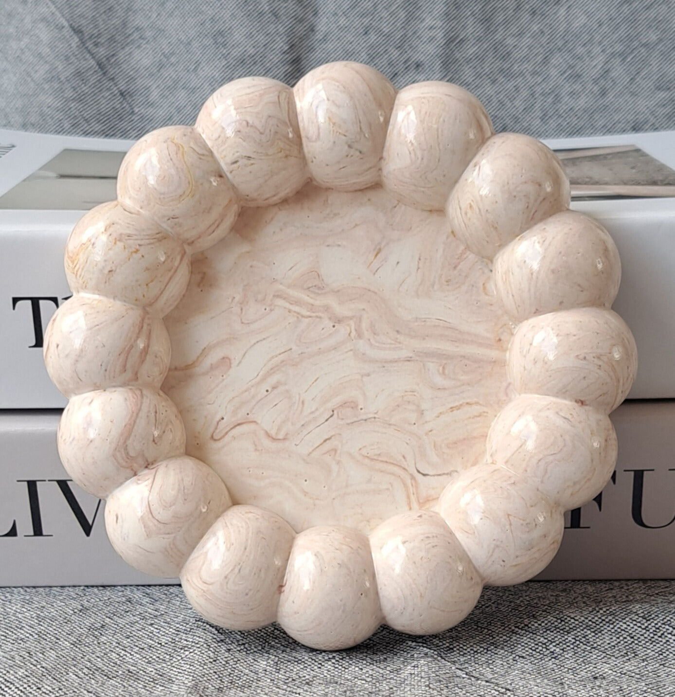 Prato decorativo redondo, em tons outonais de amarelo, bege e terracota, que trazem calor e elegância a qualquer espaço.